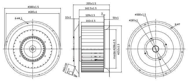 ②組成部件:高效外轉子交流電機、鍍鋅鋼板材質多翼前傾式離心葉輪、免維護深溝球滾珠軸承、靜電粉末噴塑轉子。