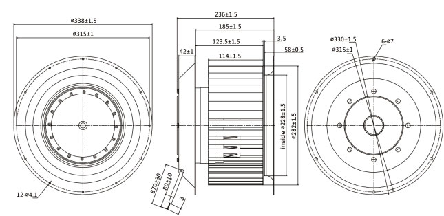 ①性能參數:風輪直徑為280mm,由4極和6極額定電壓為230/400V,頻率50Hz,分單相電容運轉和三相異步運轉電機組成,可輸送的最大風量為3700m3/h和2400m3/h。